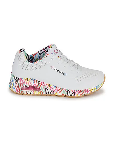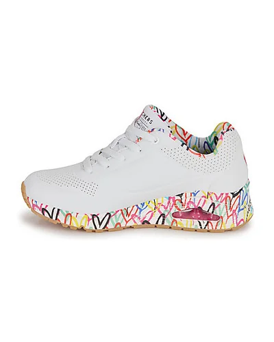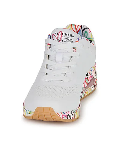 Baskets basses Skechers UNO Blanc Disponible en taille femme. 35. Issue de la collaboration Skechers x JGoldcrown avec les dessins iconiques #Lovewall de l’artiste muraliste. Semelle intérieure confortable à mémoire de forme Skechers Air-Cooled Memory Foam® Semelle intermédiaire à coussin d’air visible Skech-Air® .Femme > Chaussures > Baskets..
